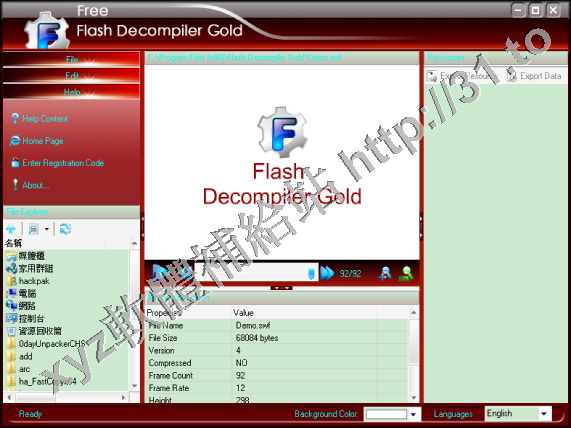flash動畫分解成圖片、文字、聲音、字體、層等,允許你重新修改和編輯!軟體操作