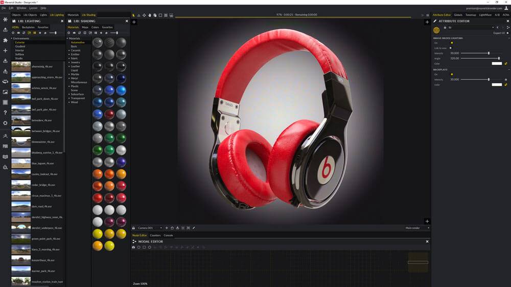 Maverick Studio在使用者介面設計和工作流程方面,Maverick(也被稱為Maverick Render)與Dimension(Adobe的3D合成軟體)非常類似,視區左側的面板包含現成的資源庫;右側的選項卡式面板屬性和更高級的控制項選項,使用者首先輸入一個3D模型,然後拖動現成的材質,在場景中定位渲染攝像機,並通過HDR環境或直射光來設置燈光。